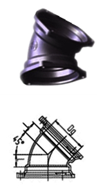 又稱為雙法蘭鑄鐵管件 - 45°彎頭, 雙承口45°彎頭,指兩端全部為承口,采用法蘭連接,B型膠圈密封的鑄鐵管件。 B型鑄鐵管和管件是目前國內(nèi)常見的連接方式,特別是在高層排水有更好的強(qiáng)度,地下排水中有更好的性能和優(yōu)勢。