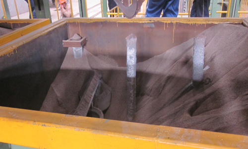 根據(jù)鐵水成分標準要求,加入適量廢鋼、硅鐵,在中頻電爐內調整鐵水成分,直至符合工藝要求。